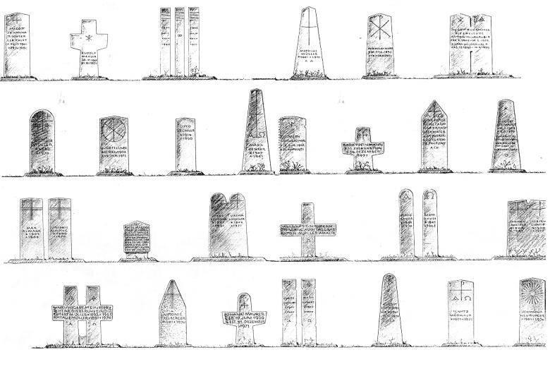 In diesem Bild aus der Zeitschrfit „Steinmetz+Bildhauer“ (1971, Heft 5) hat Anton Woger die typischen Steinformen gezeichnet, die auch auf dem Mayener Grabfeld zu finden sind.